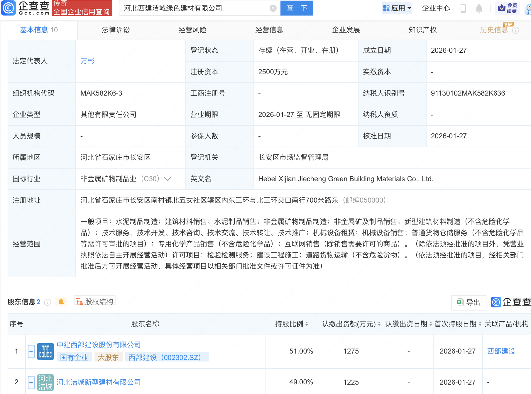 近日,河北西建洁城绿色建材有限公司成立,注册资本2500万元,经营范围包含:非金属矿物制品制造;非金属矿及制品销售;新型建筑材料制造(不含危险化学品)等。企查查股权穿透显示,该公司由西部建设(002302)等共同持股。